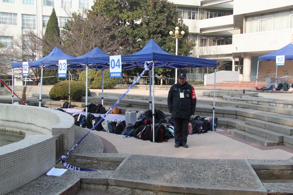 安全管理处领导高度重视,徐明春处长和分管舜耕副处长辛雪峰亲临现场指挥。严格按照学校要求,1、2、3、6号考试用教学楼前五个台阶处各安排两道封闭式通道,每个通道入口处安排一名保安引导考生有序通行,每个教学楼前安排一名保安,检查考生、监考员、考务人员的证件;图书馆前广场划定警戒区域,拉好隔离带,进行封闭式管理;6号教学楼前北侧封闭,教学楼前安排了2名保安,引导学生存放物品;考场周围加强巡逻,严禁无关车辆、人员进入。