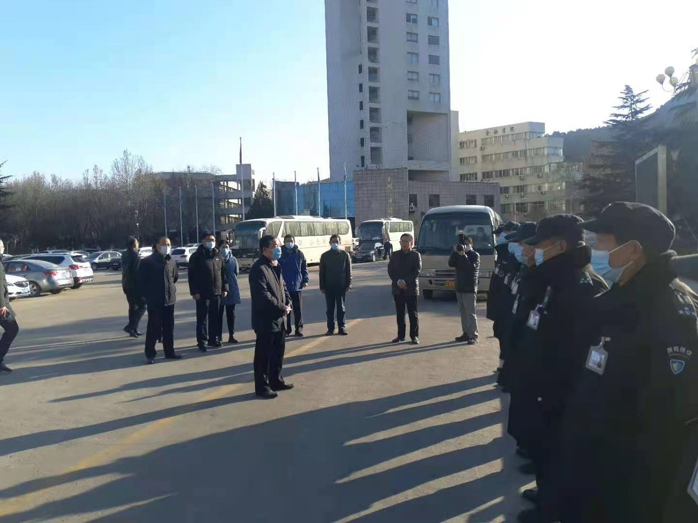 2月8号上午,校党委书记王邵军、副校长张培国一行前往舜耕、燕山两个校区,走访慰问了寒假和春节期间坚守在疫情防控一线的安保工作人员。我处徐明春处长、辛雪峰副处长、赵勇副处长及相关科室负责人陪同慰问。