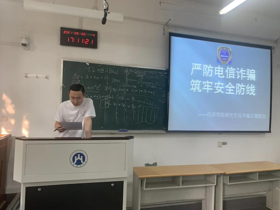 为落实学校学生教育管理工作会议精神,5月18日——21日,经济学院面对全体研究生举办了“严防电信诈骗,筑牢安全防线”反诈骗主题班会。会议由研究生各班班长和团支书主持,全体研究生参会。