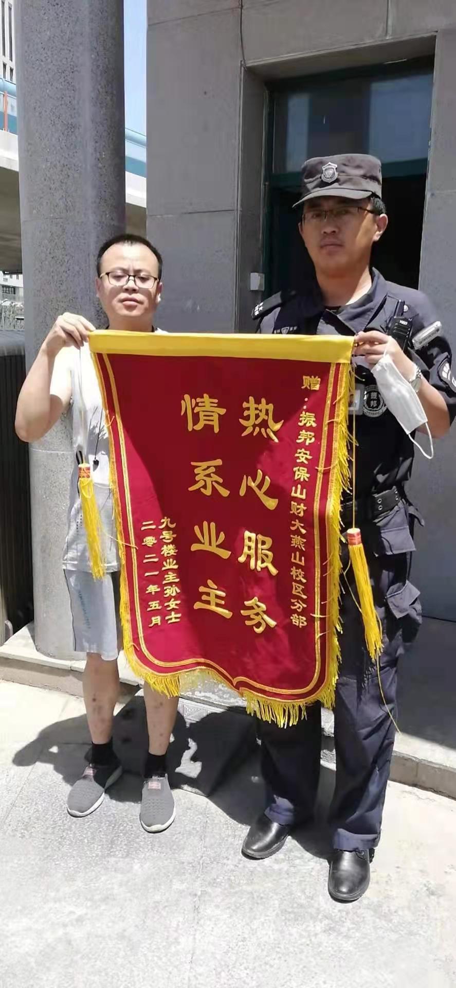 5月27日上午,我校燕山校区西区一教工家属来到燕山校区西门安保值班室,向振邦安保燕山校区分部赠送锦旗,感谢他们对家中老人的无私帮助。
