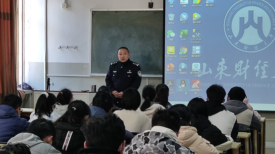 周所长向同学们介绍了当前电信诈骗形势、辖区内大专院校电信诈骗案件,以及电信诈骗案件的惯用手法,用学生身边的真实案例为同学们上了一堂生动的安全教育课。