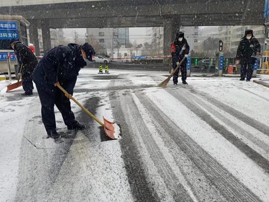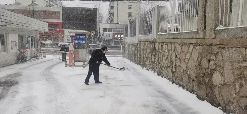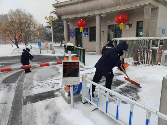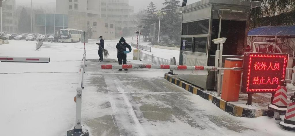 雪一直在下,他们一直在清扫。安全管理处工作人员及保安队员随时清理校门口附近积雪,避免形成结冰路滑,积极应对恶劣天气,保障安全出行,主动承担起一个保卫人的职责。
