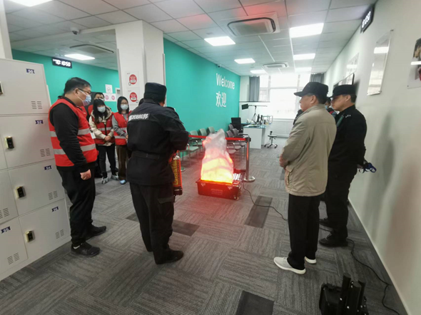 演练分理论授课和实操训练两个阶段进行,理论授课主要包括火灾危害和消防安全的重要意义、建筑消防法规、消防隐患排查与防范、火灾应急处置流程、初起阶段火灾扑救、应急疏散逃生、灭火器材使用管理等方面内容;实操训练主要利用便携式智能仿真灭火实训仪进行现场演示教学,培训完毕后,全体参训人员利用灭火实训仪进行多次仿真灭火练习。