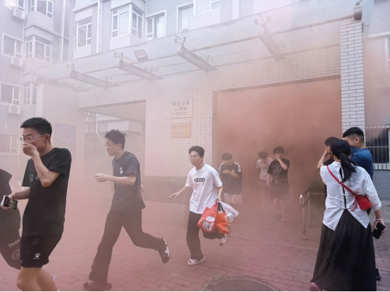 演练活动由谢申祥副书记担任总指挥,分校区有序进行。5月28日晚8时,演练首先在燕山校区和舜耕校区学生公寓同步开始;5月29日晚7时,章丘校区学生公寓应急疏散演练紧随其后展开。随着演练指令下达,预设烟雾弹释放出橙色浓烟,模拟真实火场环境。楼宇烟感报警系统立即触发,消防应急广播同步播报疏散指令。公寓闸机、电磁门等设施在“一键断电”机制下自动开启,确保疏散通道畅通。
