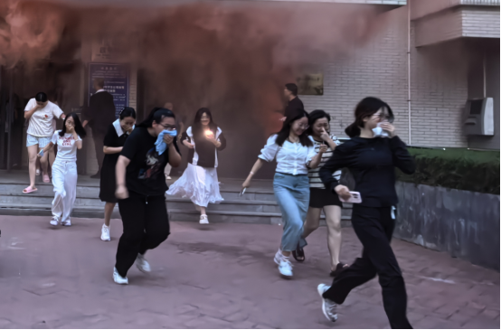 在工作人员(学生干部、安保、物业人员等)的现场引导下,参演学生严格遵守演练纪律,服从组织指挥和调度安排,严格按照预案规定的流程和逃生路线疏散逃生。大家用湿毛巾捂住口鼻,采取低姿弯腰的规范姿势,快速、有序地撤离宿舍楼宇,最终安全抵达指定的室外集合地点。