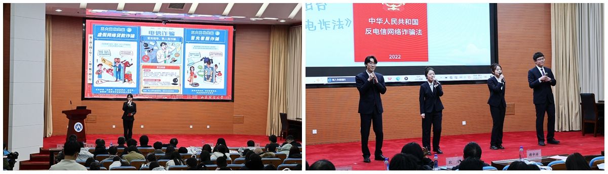 济南市公安局反诈中心民警、历下分局治安大队民警、济南市司法局反诈宣讲员以案说法,用真实案例警示师生,提高识骗、防骗、拒骗能力;学校学生反诈宣讲团表演的“反诈同心 你我同行”更是用学生身边的真实案例,告诫师生,电信诈骗无处不在;恒丰银行员工用鲜活的案例再现银行反诈场景、泉城金融卫士志愿团的叔叔阿姨们用改编传统戏曲、歌曲的形式宣传反诈防诈知识,警示师生只有提高警惕,才能构筑起坚不可摧的校园反诈共同体。